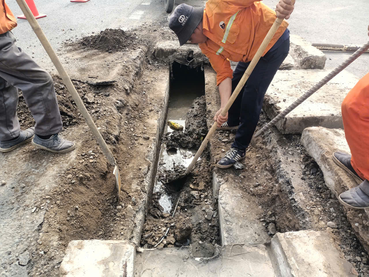 Nạo vét bùn đất, rác thải trong rãnh thoát nước, cống ngang.